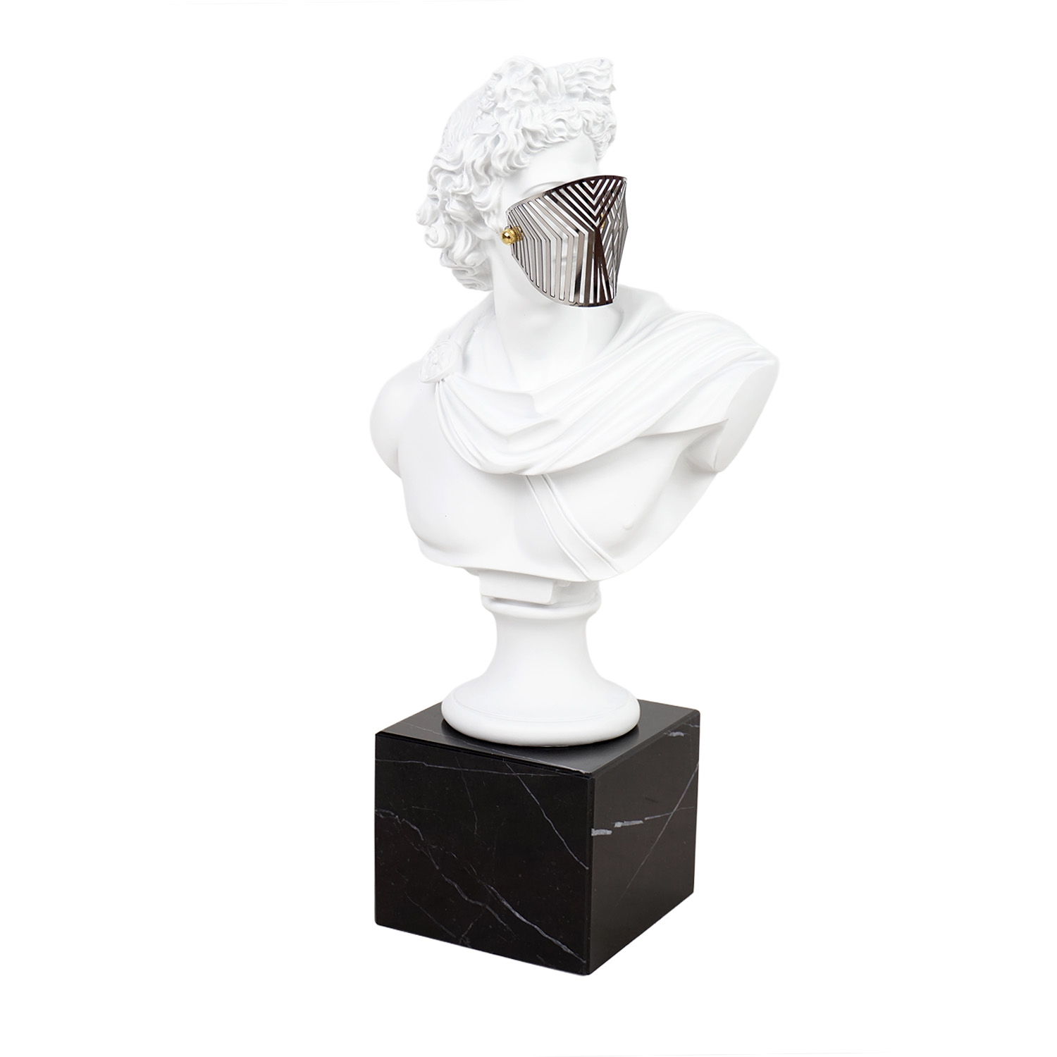 CO-TR5782W MAN & MASK statue 35x18x63 cm – WHITE/SILVER + black marble stand